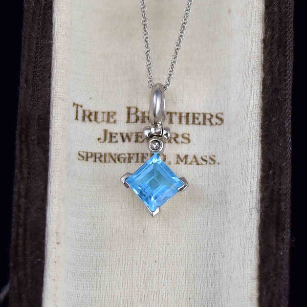 Vintage 10K White Gold Diamond Blue Topaz Pendant Necklace