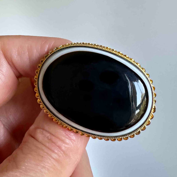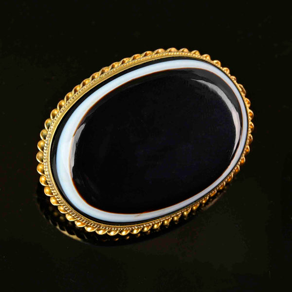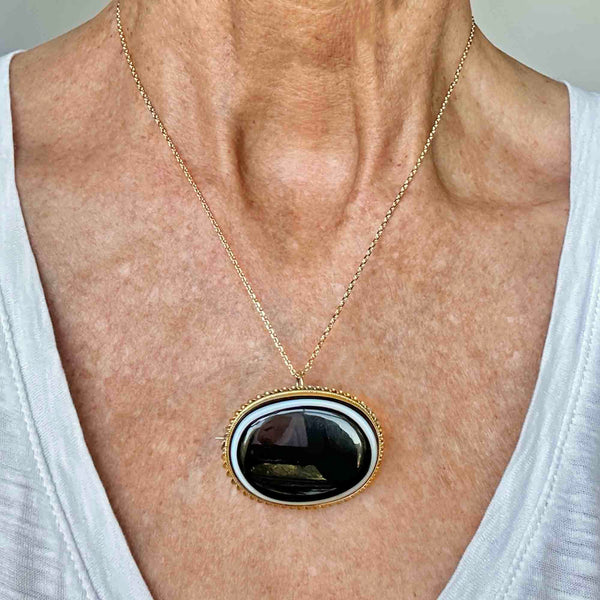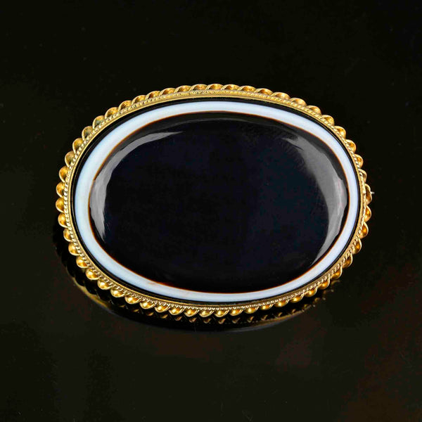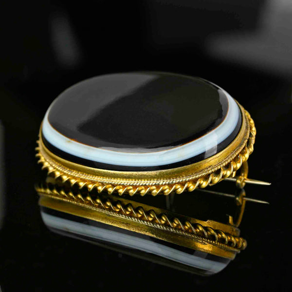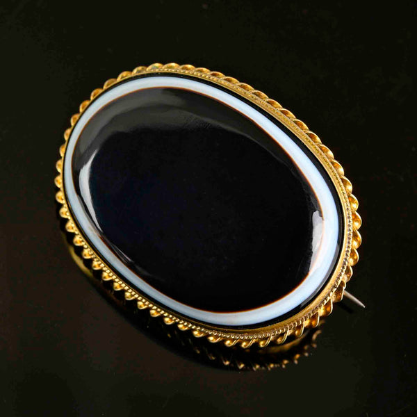 This charming nineteenth-century Victorian brooch pendant features a hand-carved Scottish banded bullseye agate set in a dazzling gold gilt twisted braid frame. The striking oval agate showcases a bold blackish-brown center ringed by a crisp white band and a deep black outer band. It fastens securely with a tubular hinge and c-clasp and includes a ring to wear it as a pendant. A delightful treasure that brings a playful touch of versatile antique elegance!
