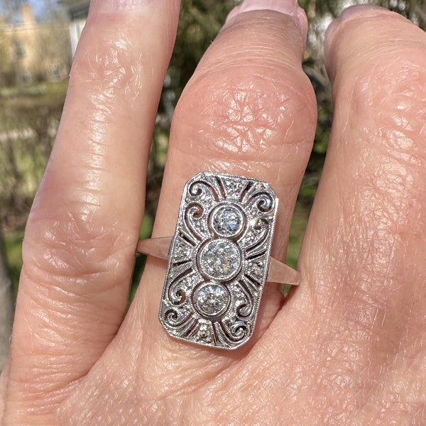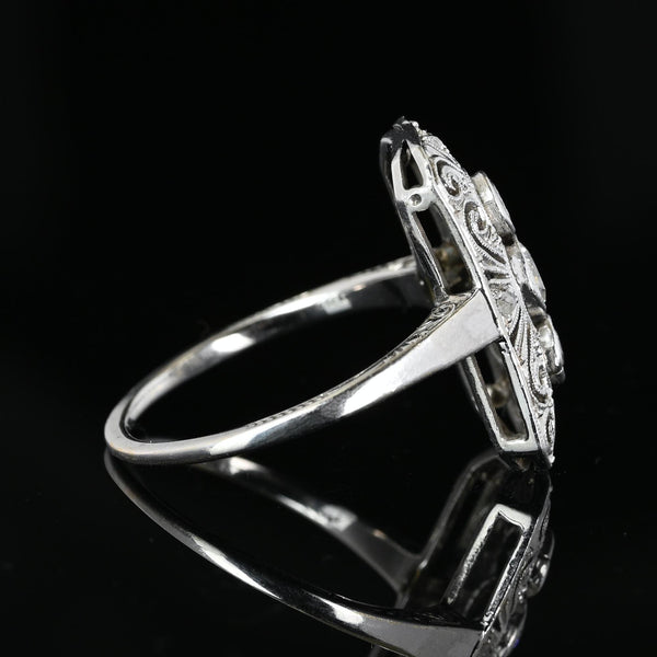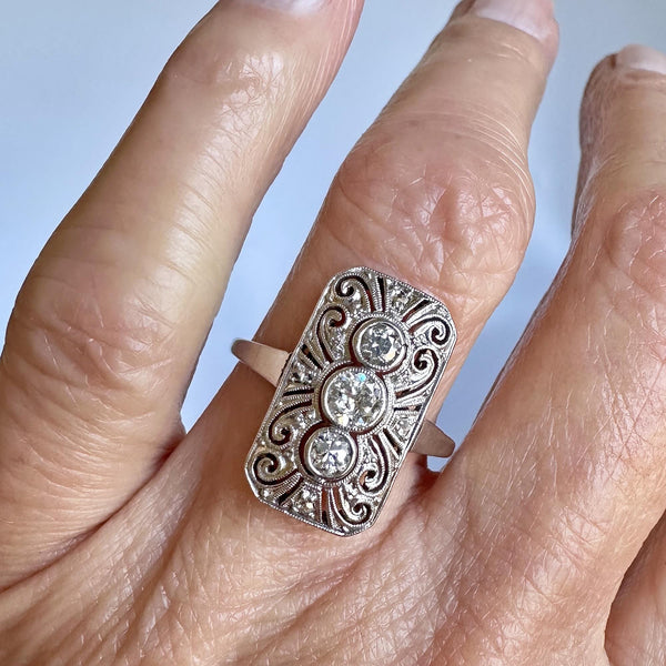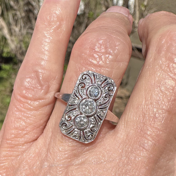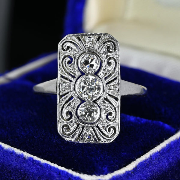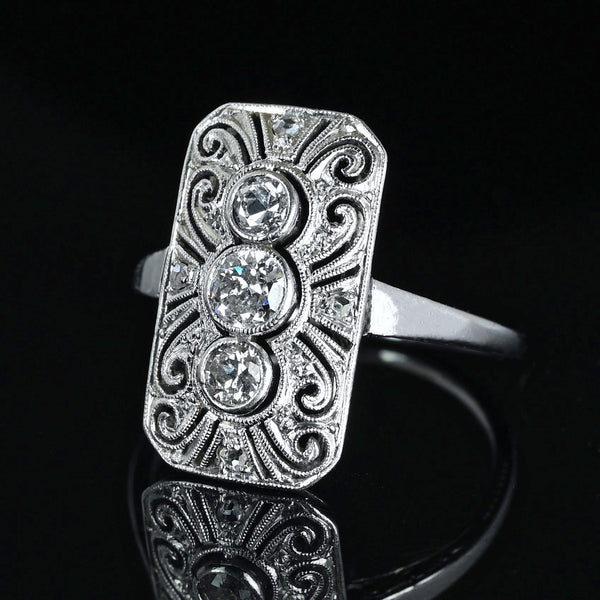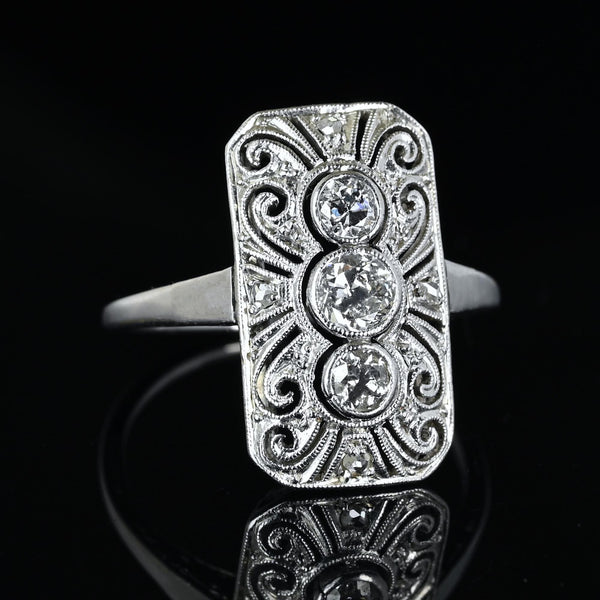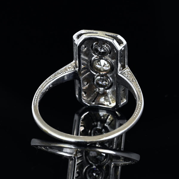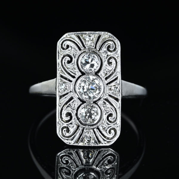 Presented in a timeless Art Deco design, this luxurious diamond dinner ring boasts a rectangular platinum top adorned with intricate milgrain detailing and a 14K white gold band hand-engraved with delicate precision. Three European-cut diamonds gleam on the front, while four brilliant rose-cut diamonds add to its opulence. A true masterpiece of the Jazz Age, this ring contains a total of .50 carats of exquisite diamonds.