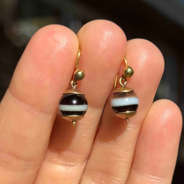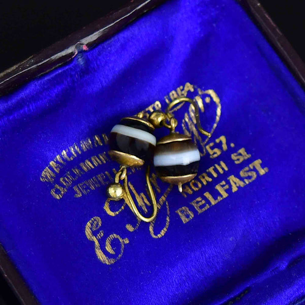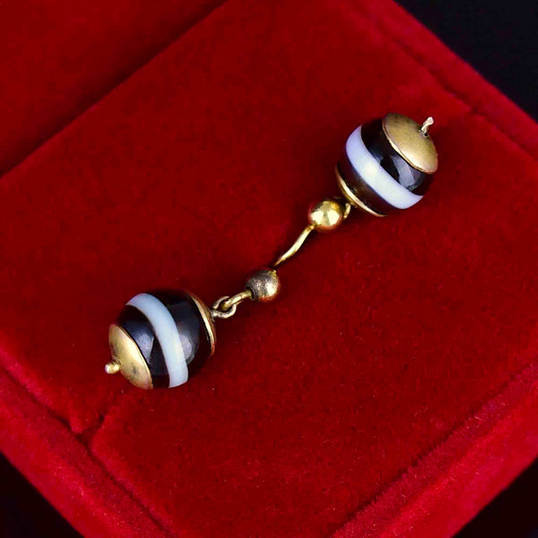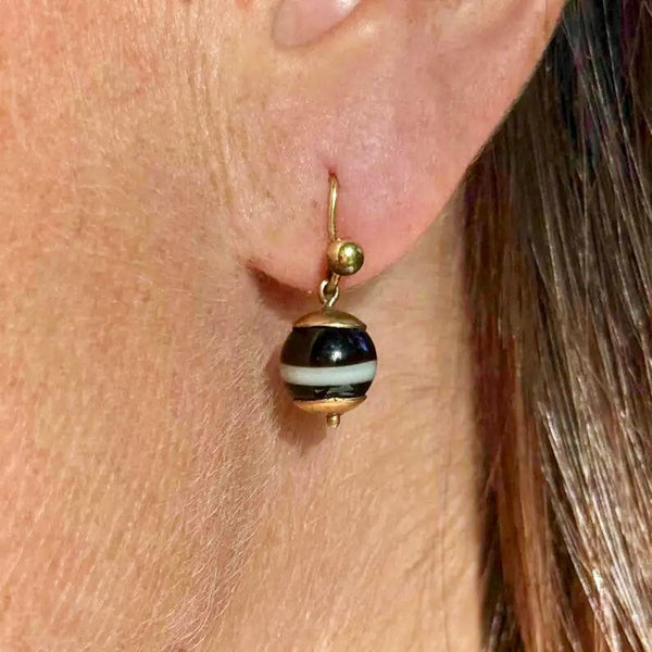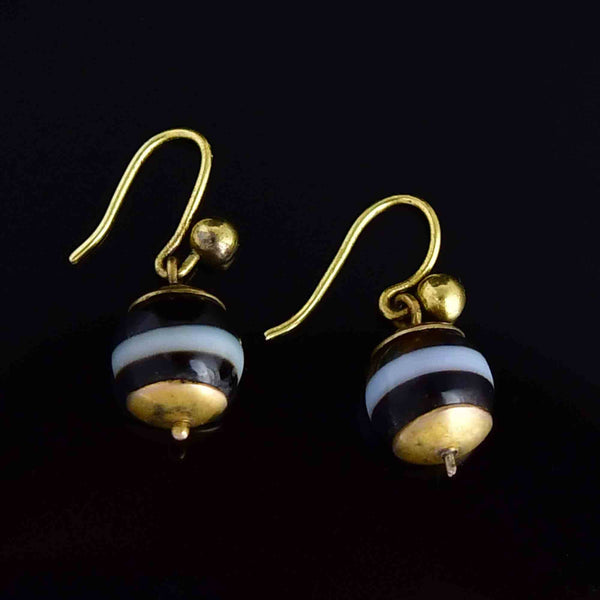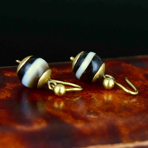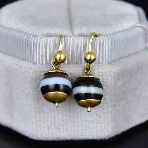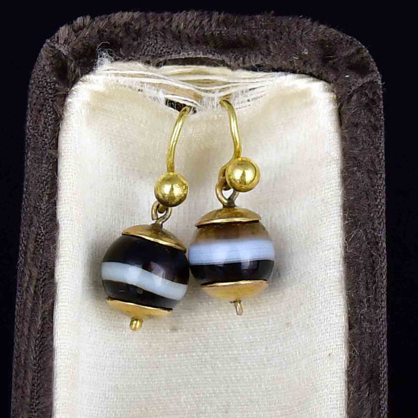 Antique Victorian Gold Banded Agate Ball Drop Earrings