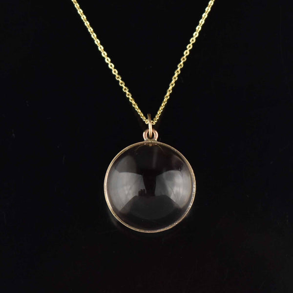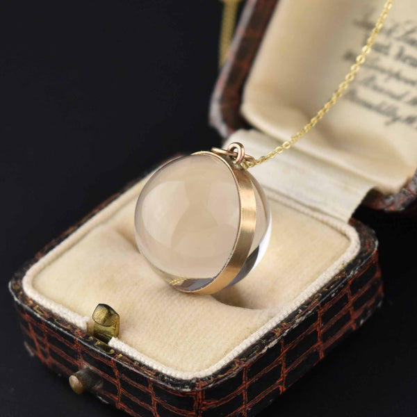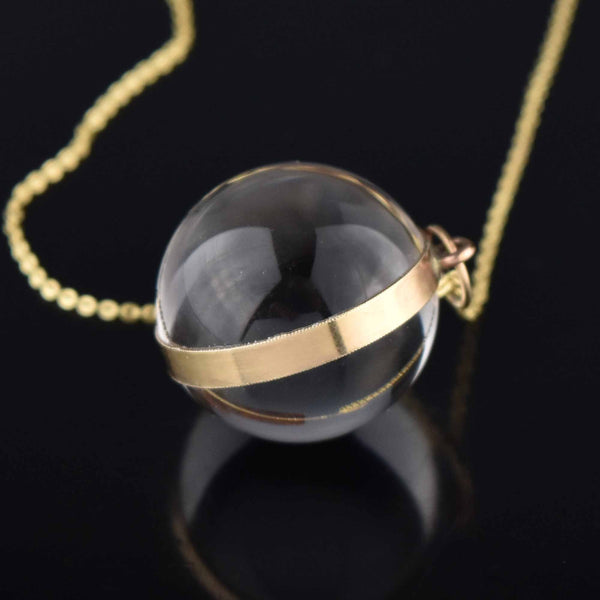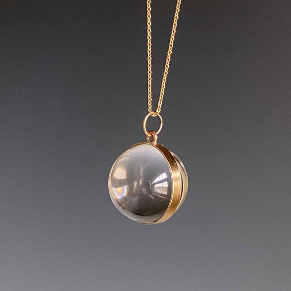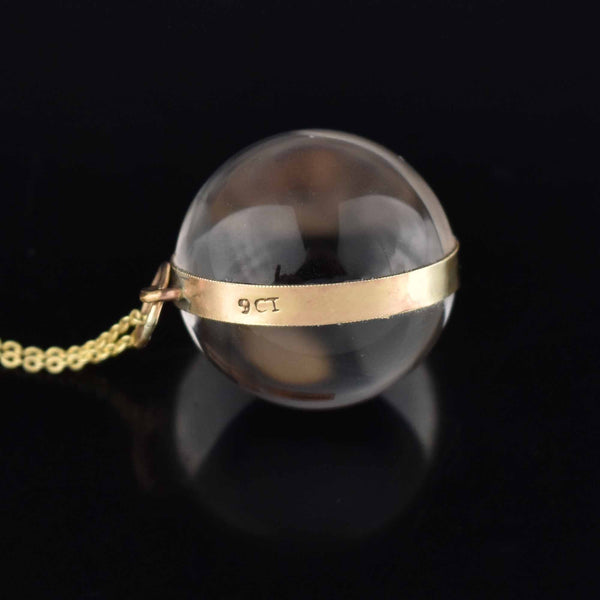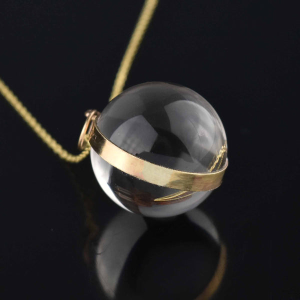 Lovely circa 1930s Art Deco pendant necklace featuring a dangling pools of light rock crystal orb pendant band wrapped in solid 9K gold. The crystal orb pendant shows items upside down and in reverse. Excellent good luck talisman!