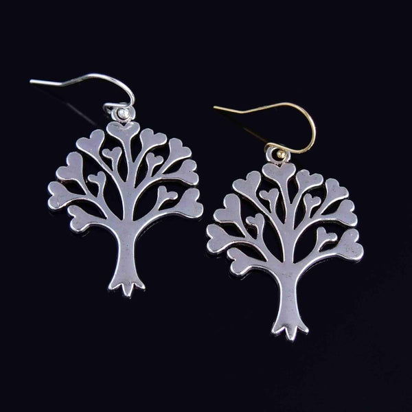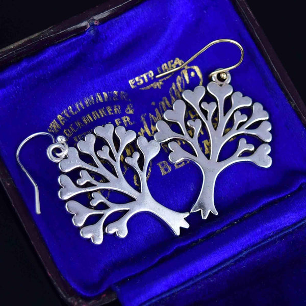 Vintage Silver Tree of Life Heart Leaf Drop Earrings